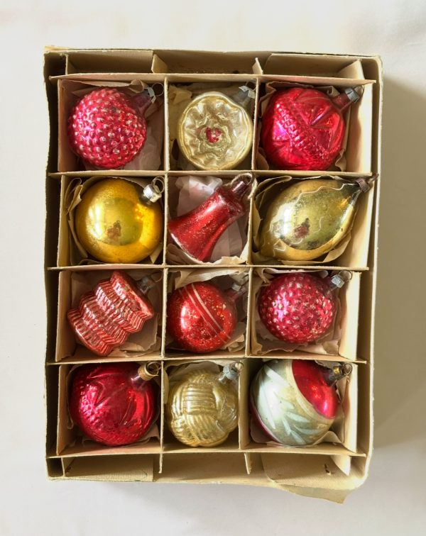 There are 12 pretty glass ornaments in various shapes and bright colors including some hand painted, one indent, and a teardrop. They are so lovely, most with their original metal caps. The oldest red bell has its original cotton cord hanging loop, definitely a 1900s pre-hook ornament! They are in very good antique condition, with a few showing the usual light wear and a bit of paint loss which adds to their period charm. A couple have chipped pikes which the cap mostly covers. They come complete in a lidded period box which is marked Poland, so not a German box but from this same early period. A nice protector of these special old gems! The box measures 6.75 inches wide by 8.75 inches. It still retains the original cardboard divider insert and paper padding.
