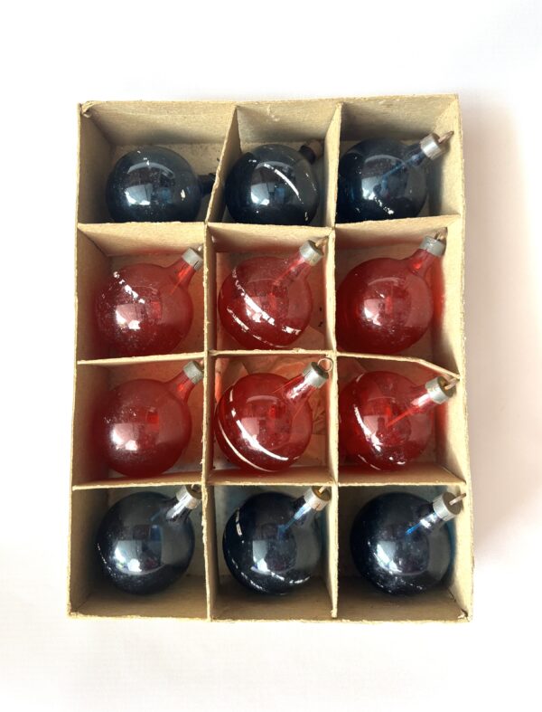 There are 12 round ornaments, six red and six blue all with their original smooth Premier caps. Each measures 1.5 inches wide and 2 inches tall. All are in very good vintage condition free of chips or cracks. Much of the original stripe decoration has worn away over these 80 years. They are stored in a very nice 1940s K & W Glass Works box. The box measures 7.75 inches by 5.75 inches and is good vintage condition. The original cardboard dividers are also present, as well as the plain lid which is torn with with one missing piece.