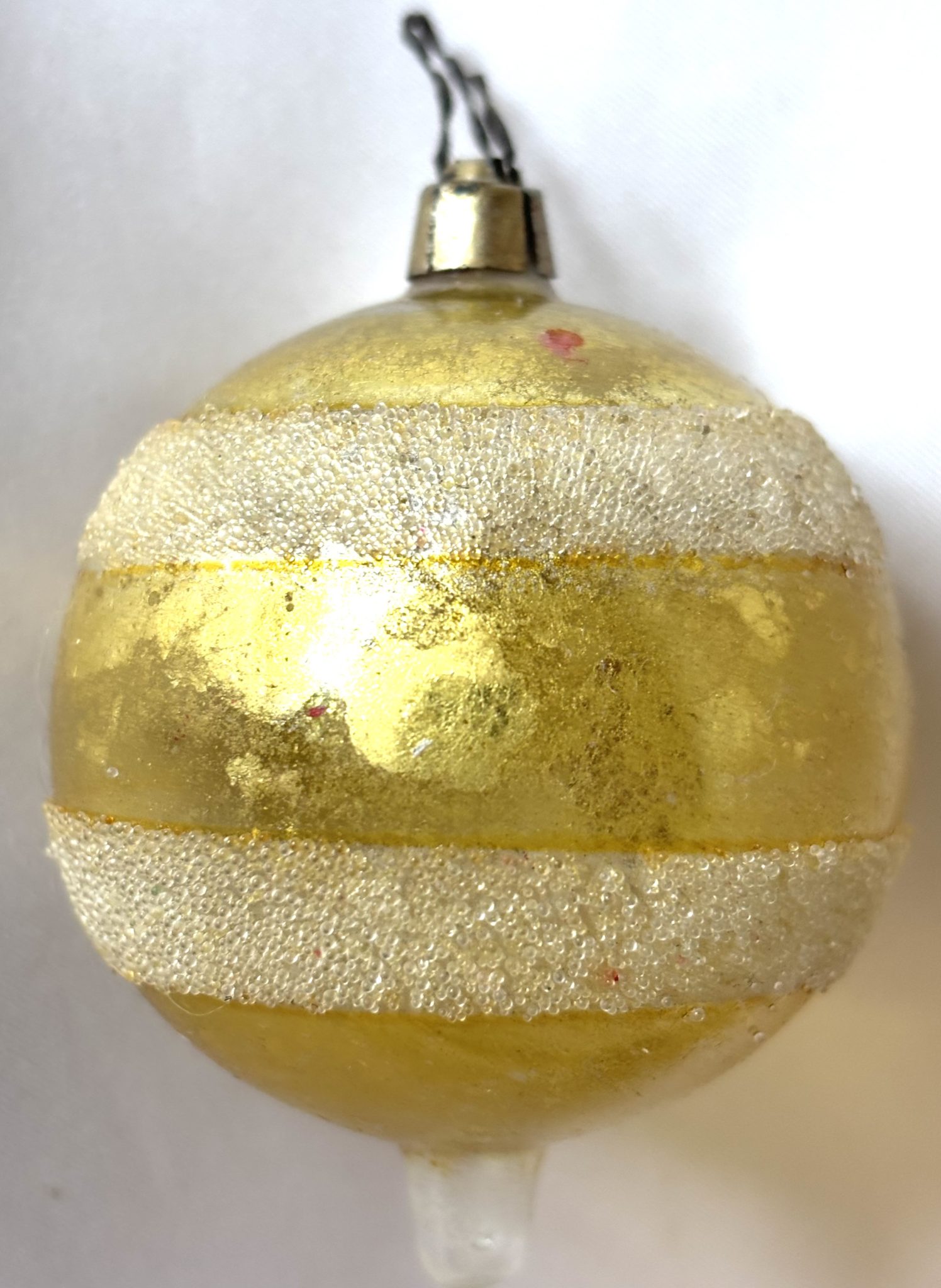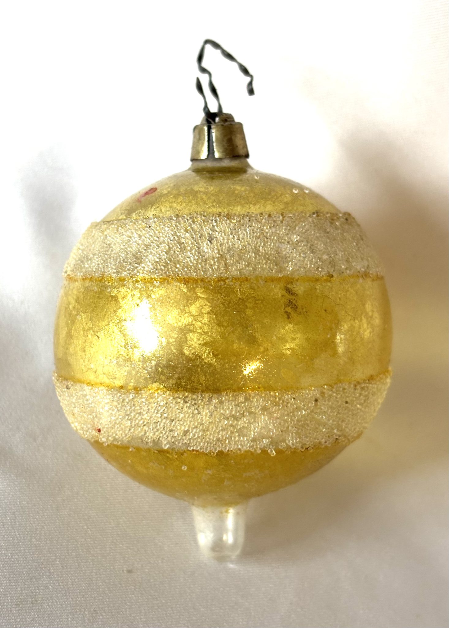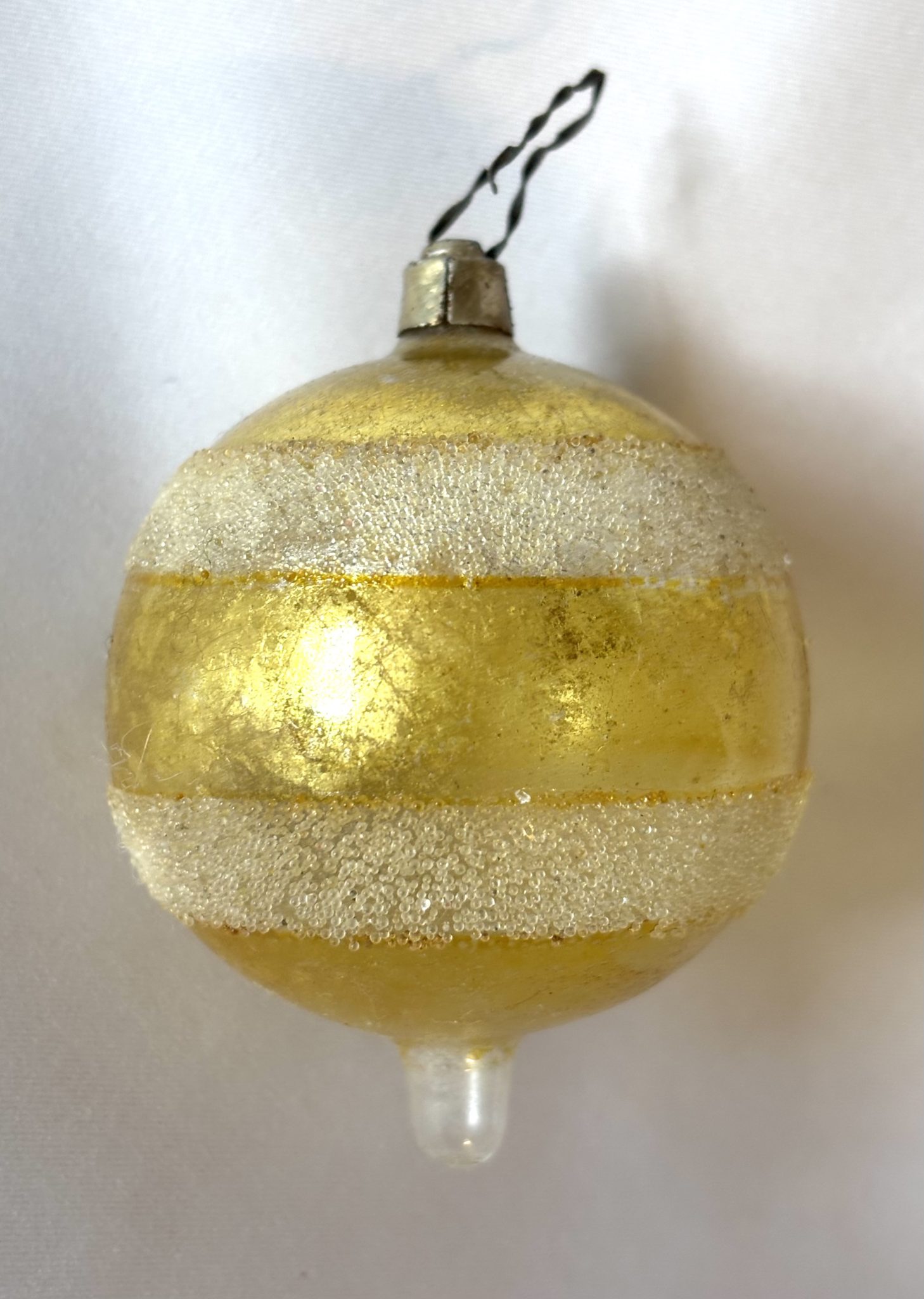 This unique round ornament is bright yellow with a long fat pontil at the bottom. Two wide stripes are clear, covered with a bumpy ground glass texture which reflects the light beautifully. It is topped with the period conical dome cap which has an original curly wire hanging loop attached. It measures 2.5 inches tall and is in excellent antique condition free of chips and minimum dew loss. Wonderful!