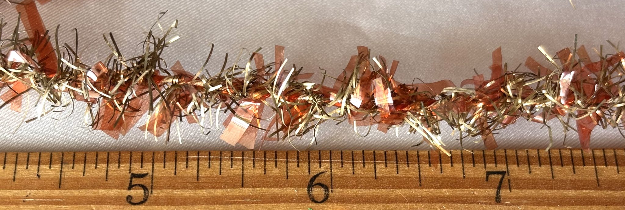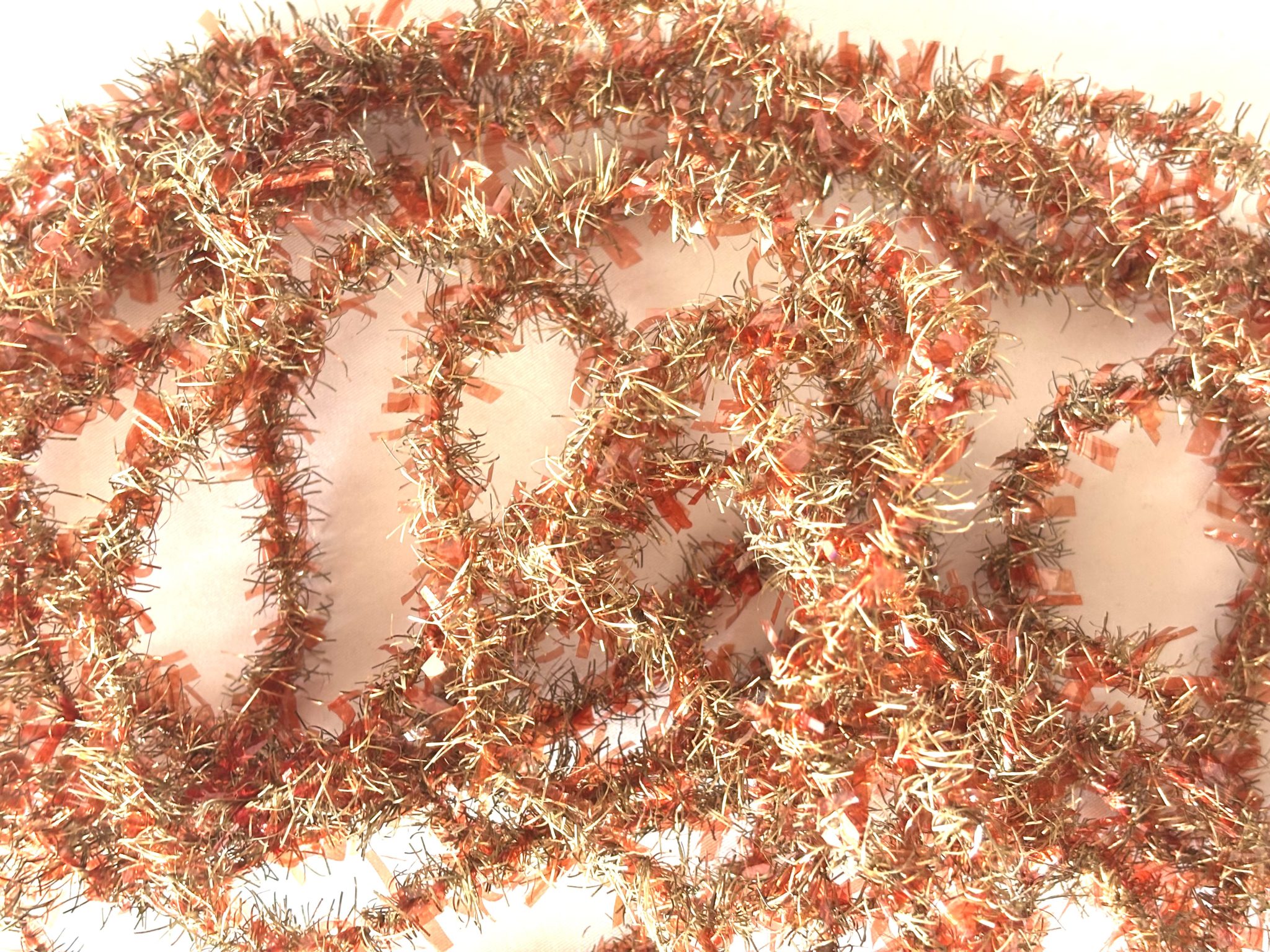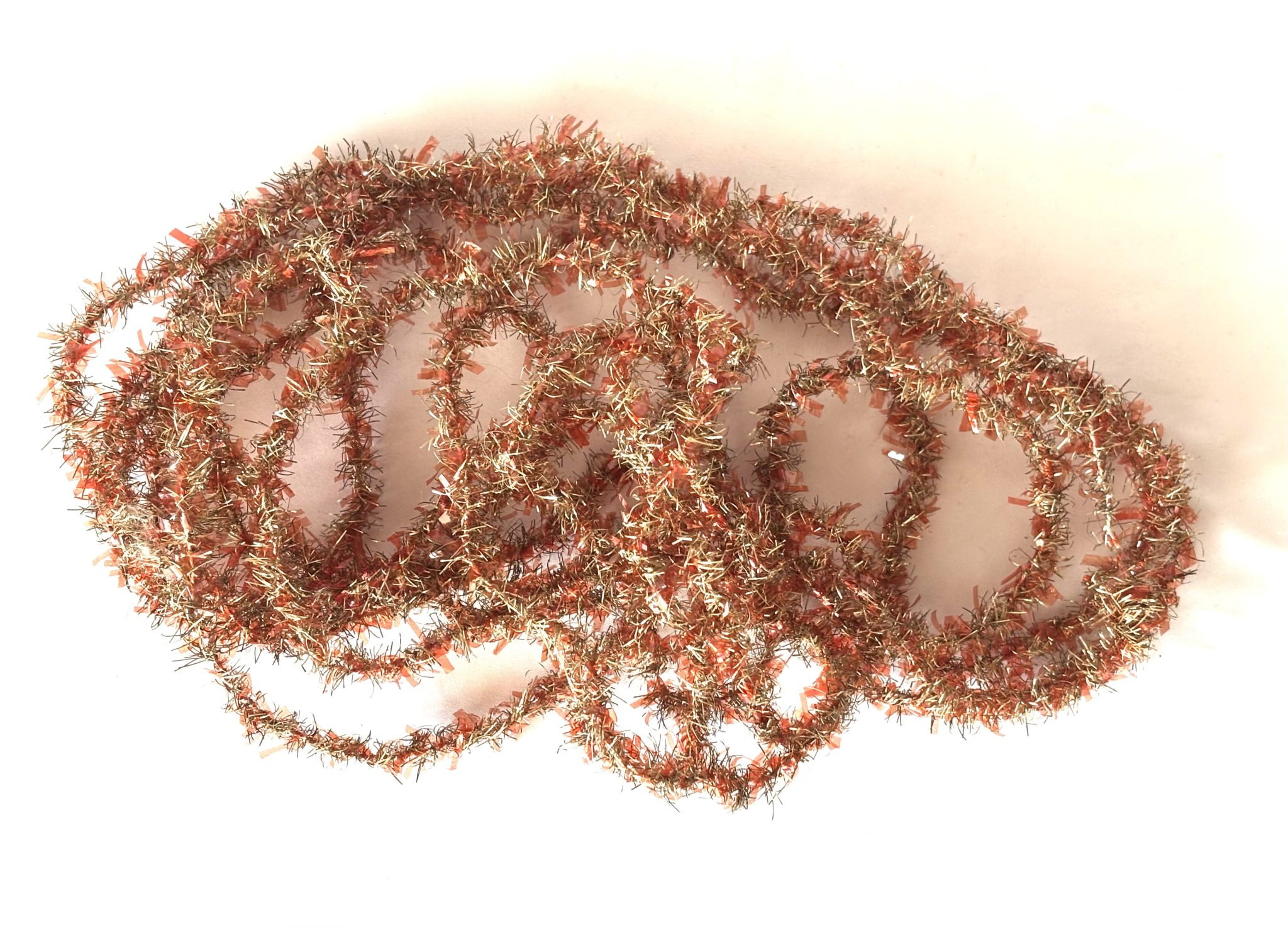 This beautiful and bright tree garland is one continuous strand with light red cellophane strips woven in with the silver strips. It is about 3/8 inch wide and is so sparkly and unique with the cellophane. It is in excellent antique condition, still bright and sparkly the tinsel aged to a light gold.