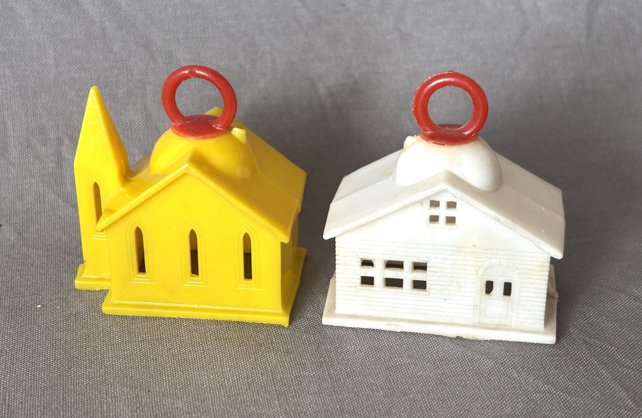 Harder to find vintage USA hard plastic building ornaments, 1940s-1950s.