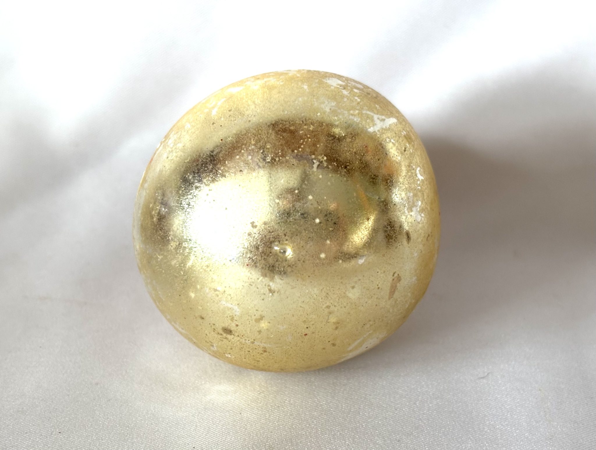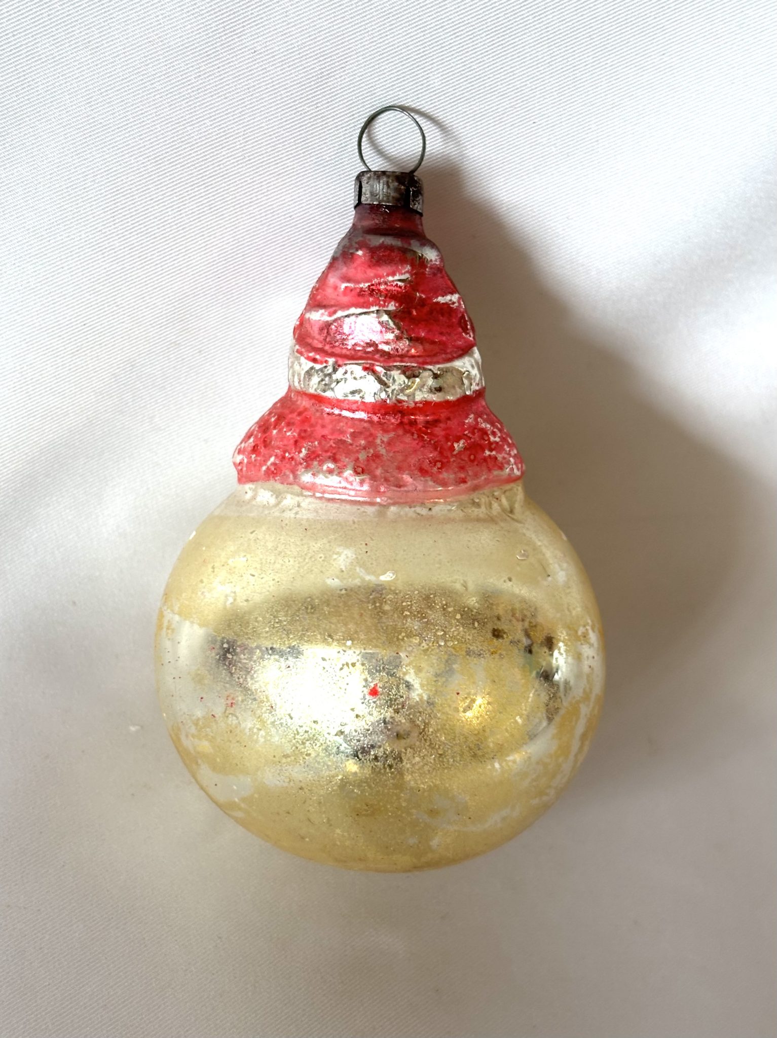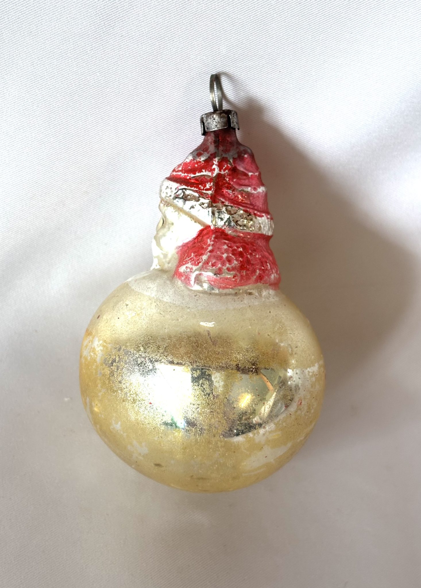 This rare combination ornament is so delightful with Santa in his classic red suit appearing to emerge from the big gold glass ball. He has an expressive hand painted face and fluffy white beard. His suit coat and hat rim have a bumpy texture, adding to the charm. The gold sphere has a tiny pontil at the bottom, indicative a blown glass ornament. It measures 3 inches tall by 2 inches wide and is in excellent antique condition free of chips or cracks. The pike is intact and is topped with the unmarked Lauscha style metal cap. There is a bit of minor paint loss.
