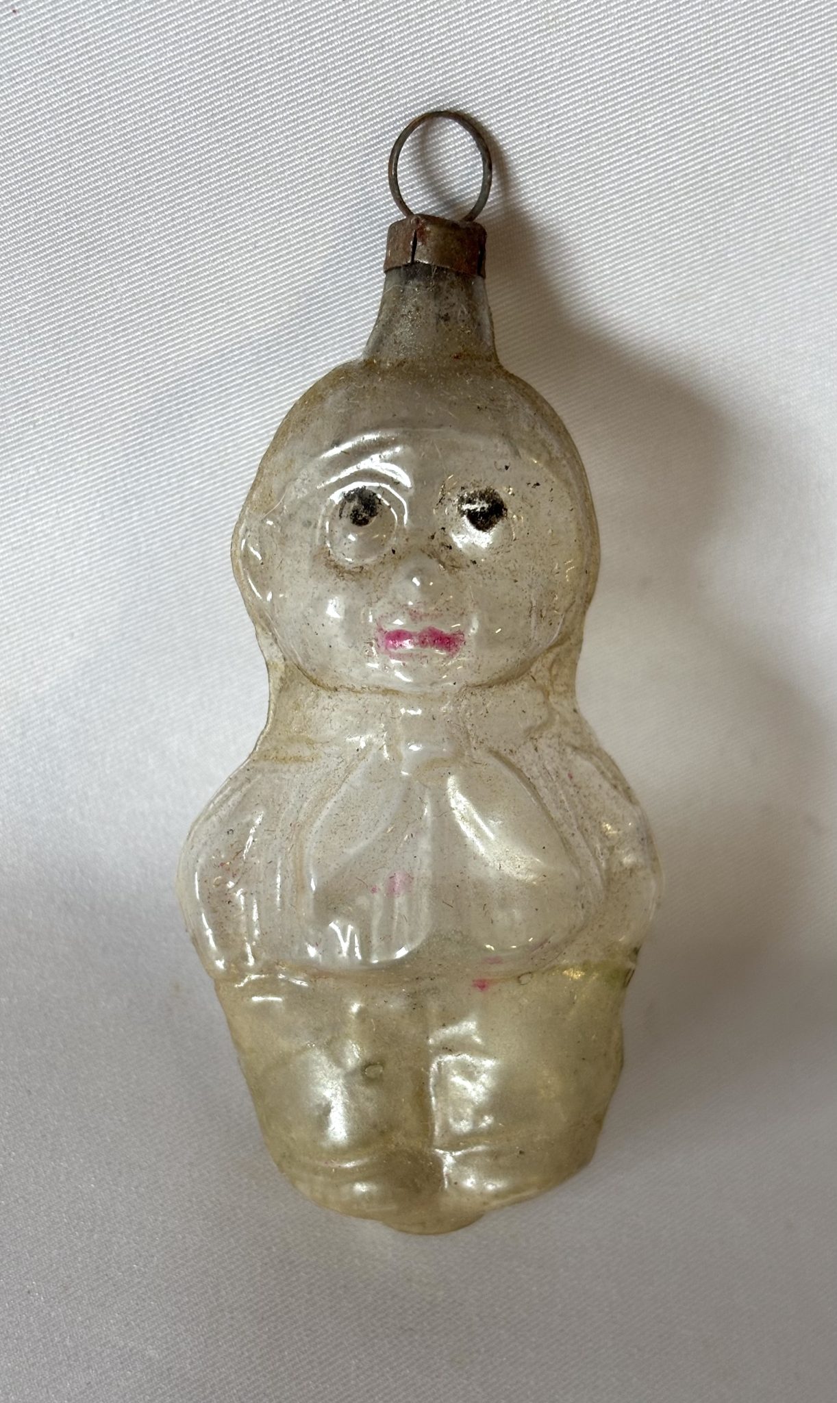 Many of the popular 1920s figural ornaments were made after comics, actors, and famous personalities. Moon Mullins was a Chicago newspaper comic strip created in the early 1920s by Frank Willard. It appealed to working-class authenticity, depicting the lives of diverse lowbrow city characters. Kayo was Moon’s street urchin kid brother with his sad face, hands in pockets with big bow scarf around his neck. Featured on page 107 of John Lightner’s “Christmas Rarities- Rare Antique German Glass Ornaments”, 2007 edition. Fabulous!