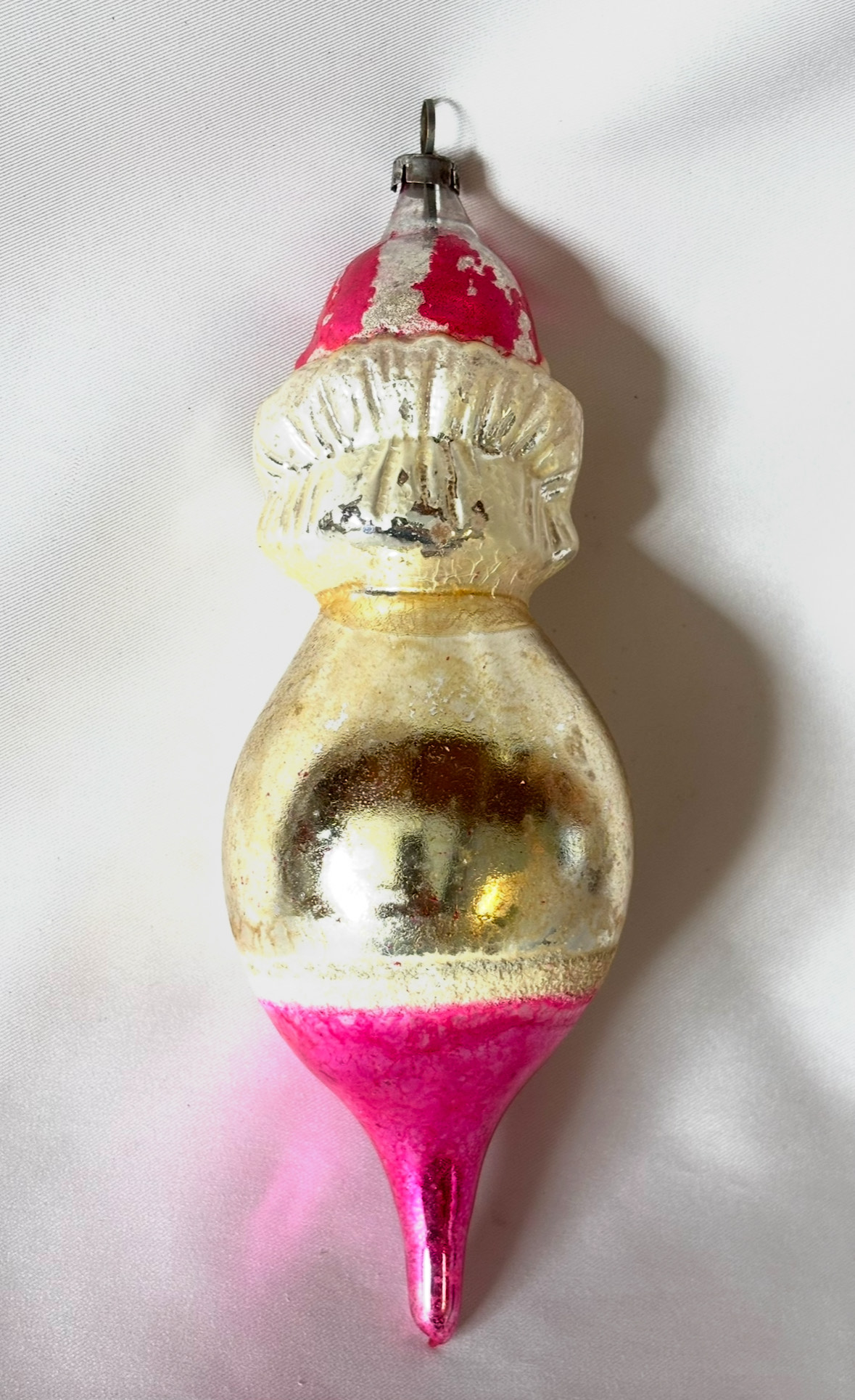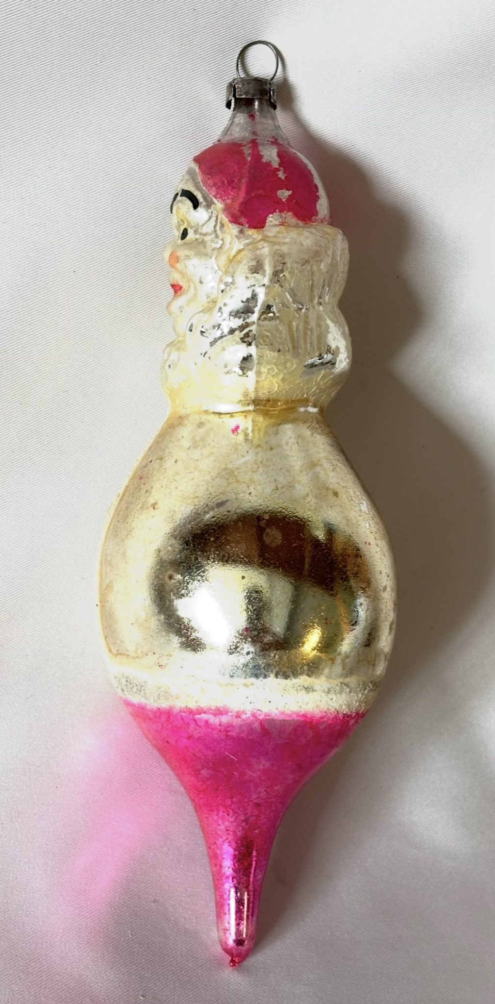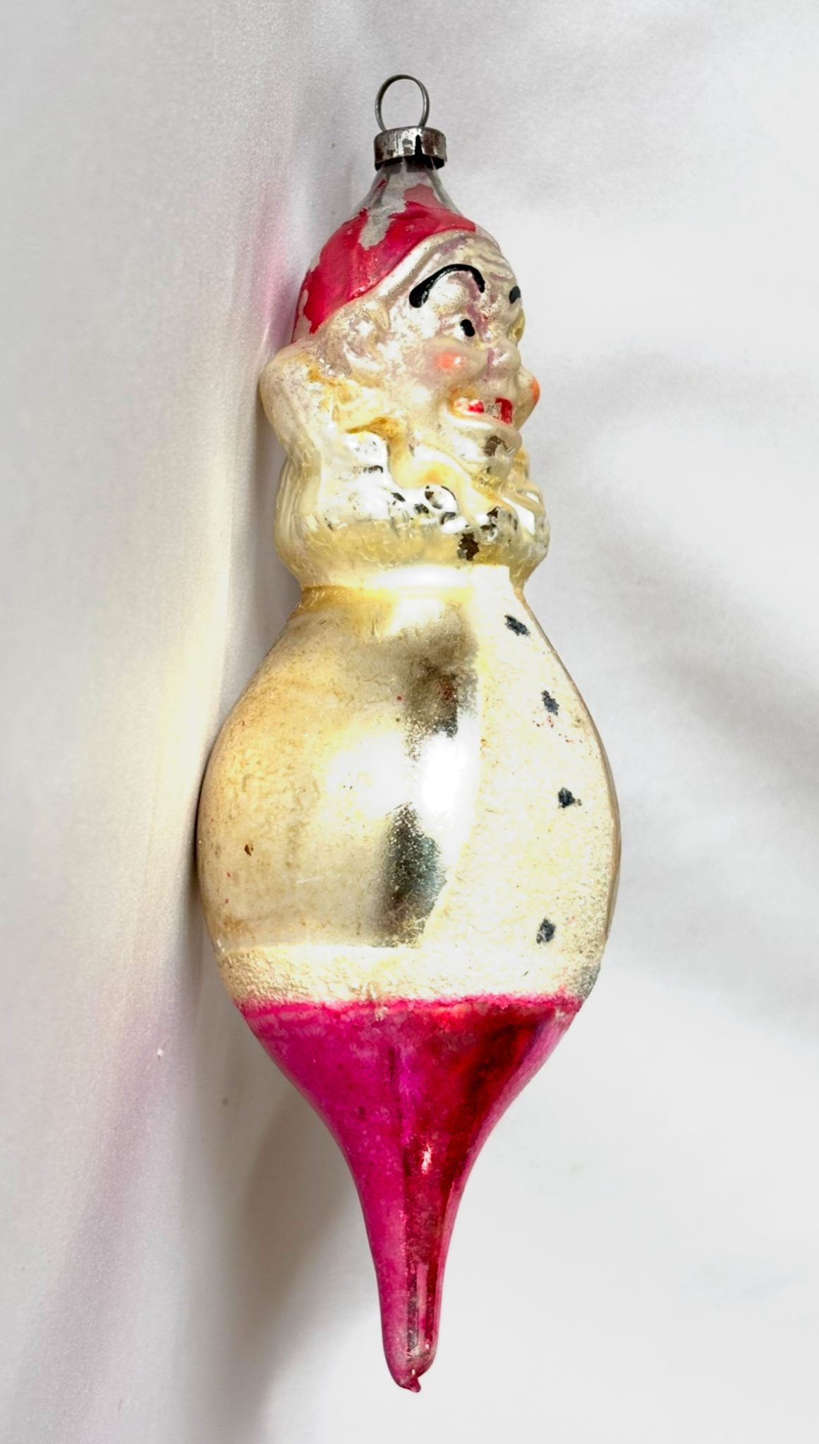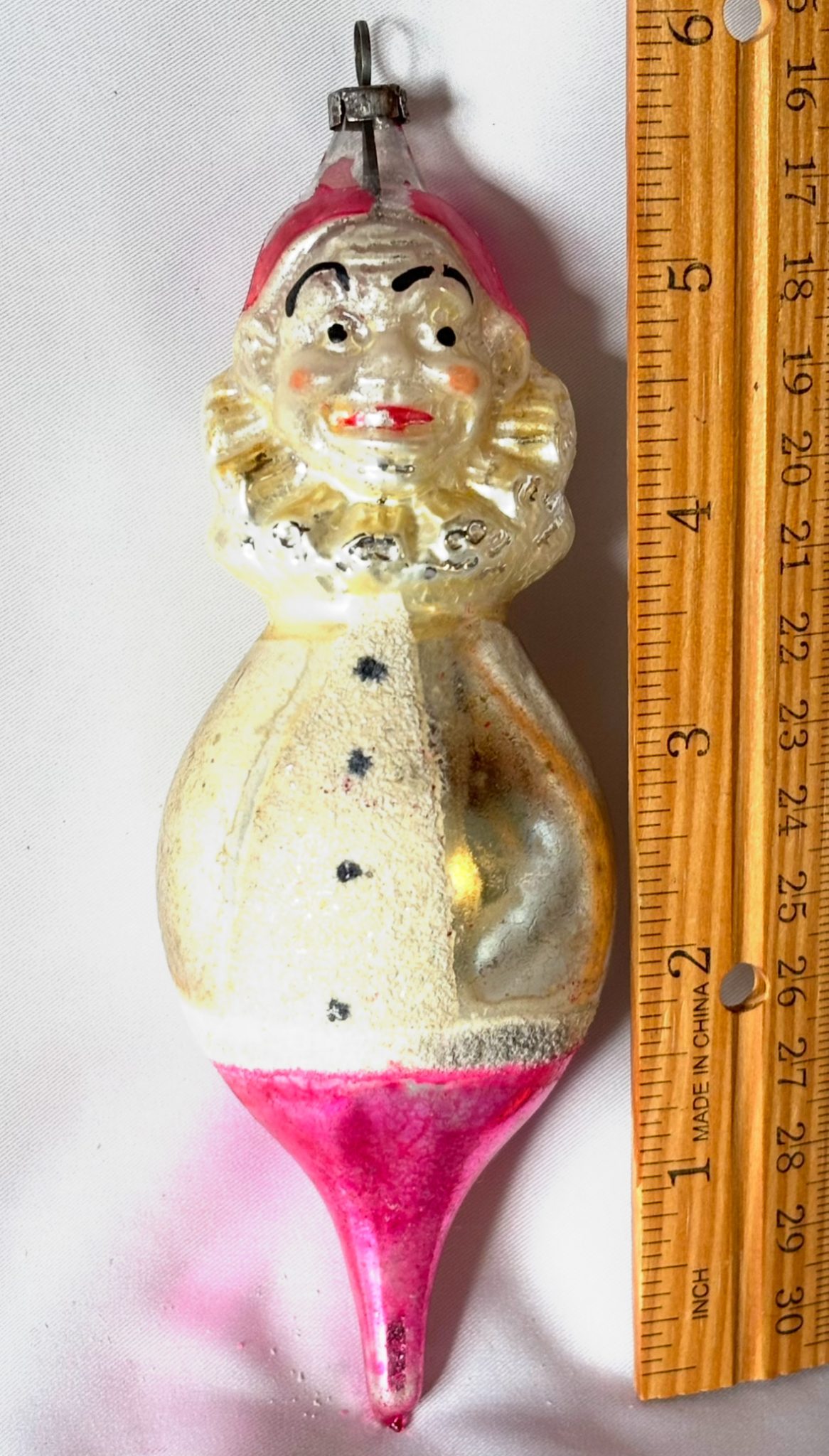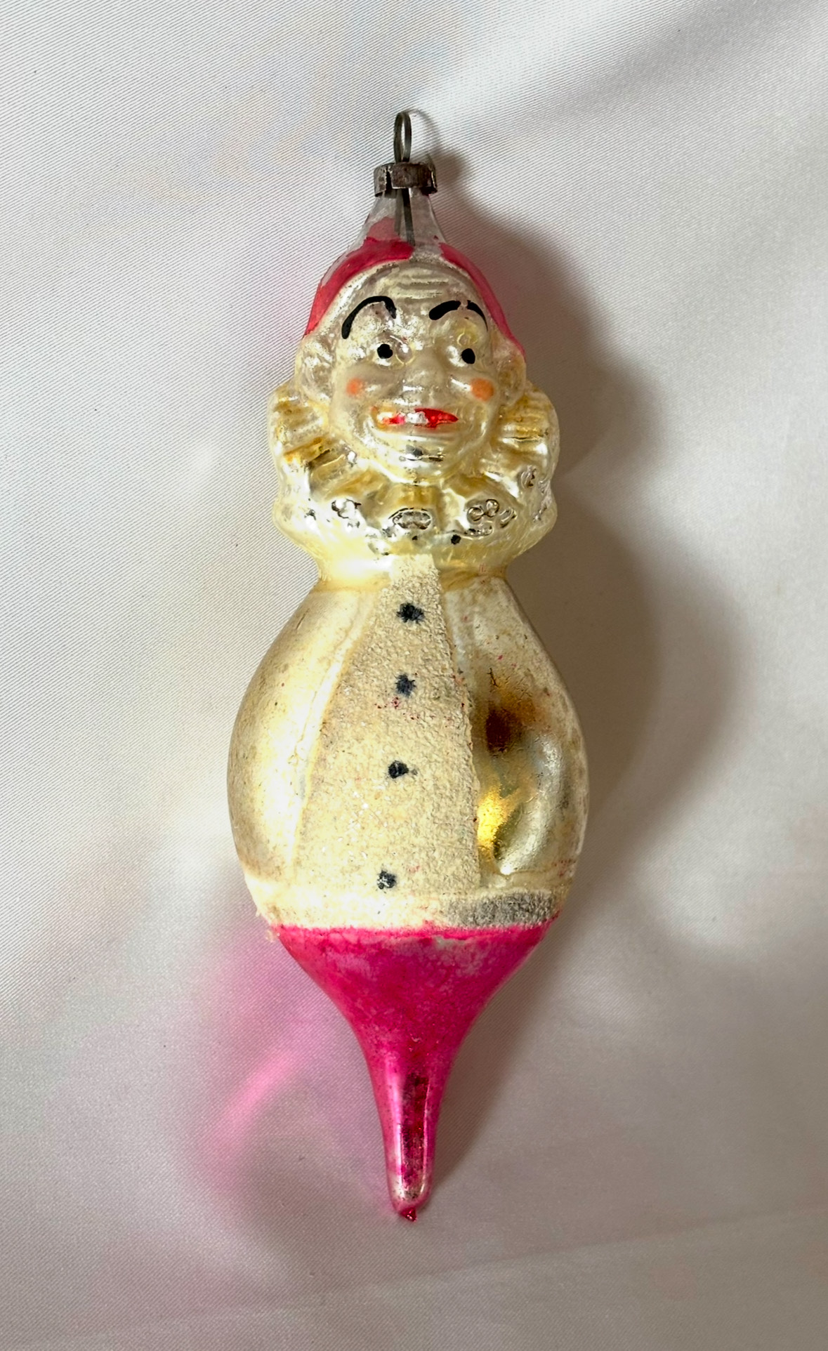 He’s delightful with that scary Joey hand painted face peeking out of that the big ruffled collar! The body features a round large belly which is covered in white mica with three black buttons. The form tapers down to a long pink lobed teardrop with a pontil, an indicator of a mouth blown ornament. He is nicely molded with lots of detail to his facial features and the classic clown hat which becomes the pike.