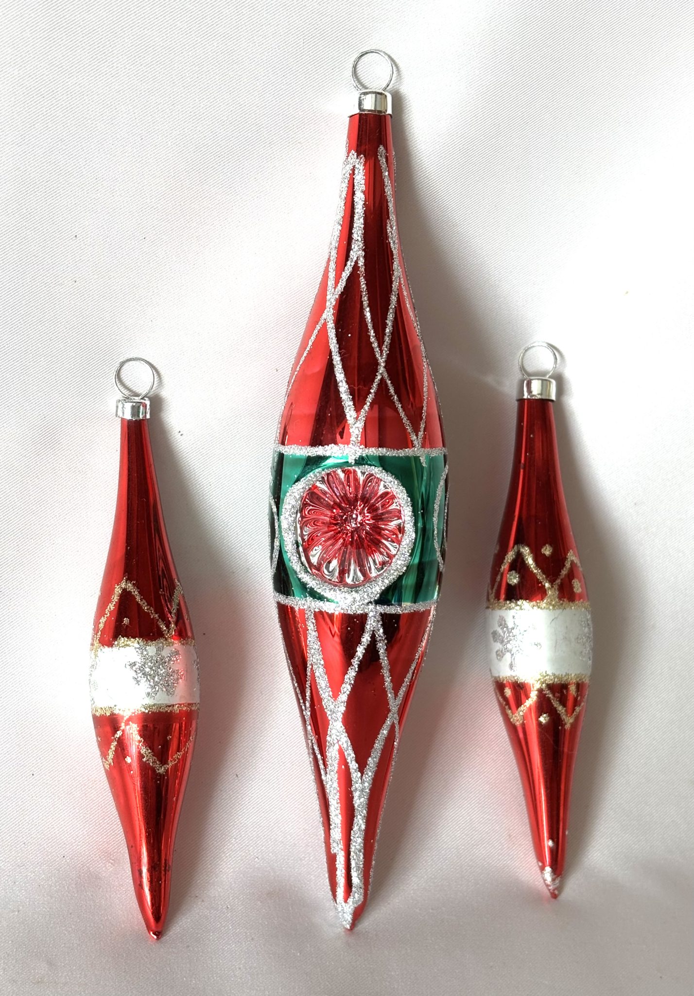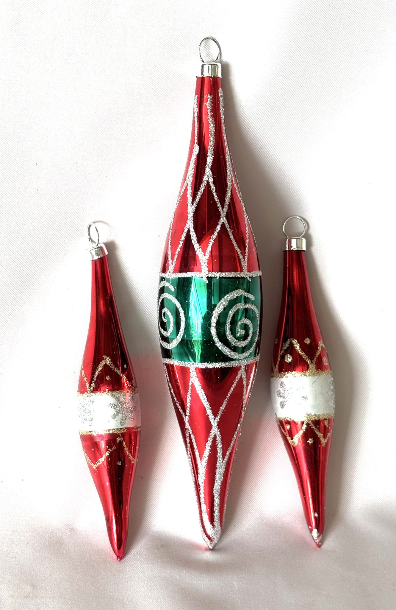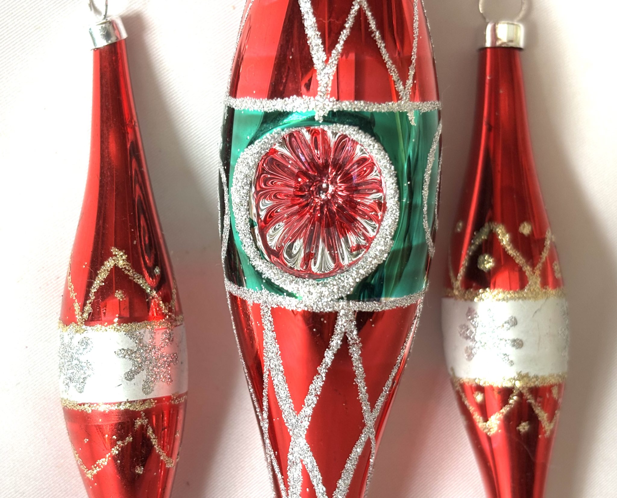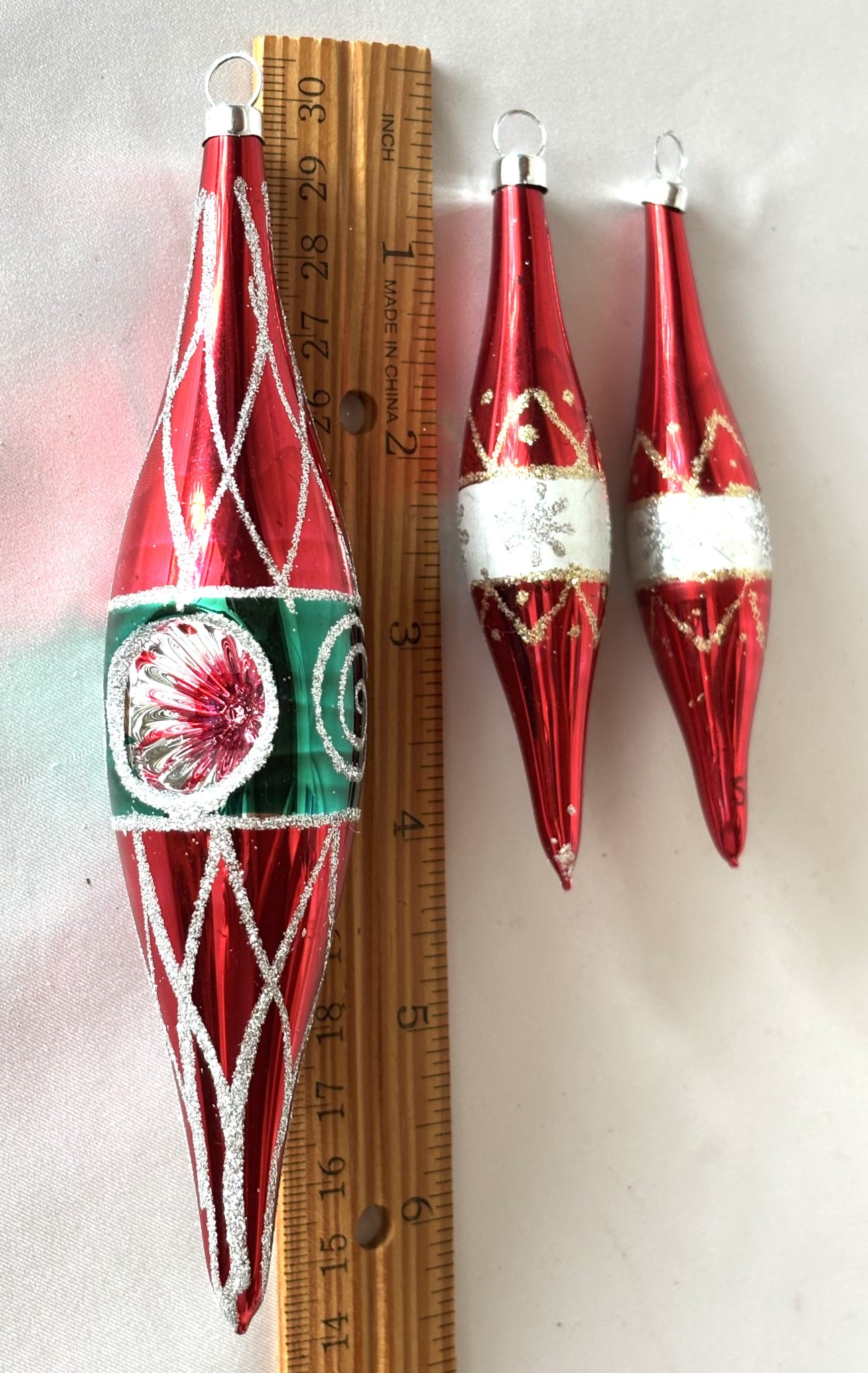 Red Silver Glass Icicle Christmas Ornaments Lot, 3 Vintage Glitter Teardrop Ornaments One Indent