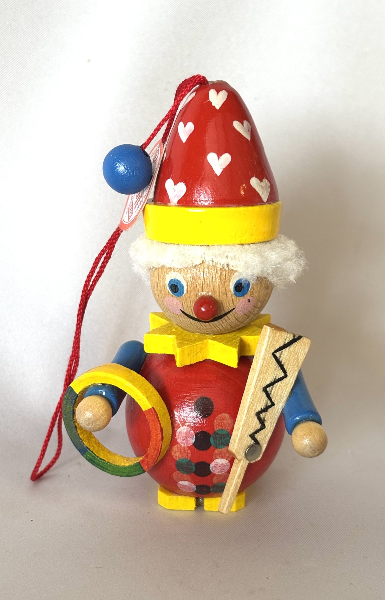 Wonderful hand crafted German Erzegebirge hanging wood ornament, a circus juggling clown in its original box, circa 1980s.