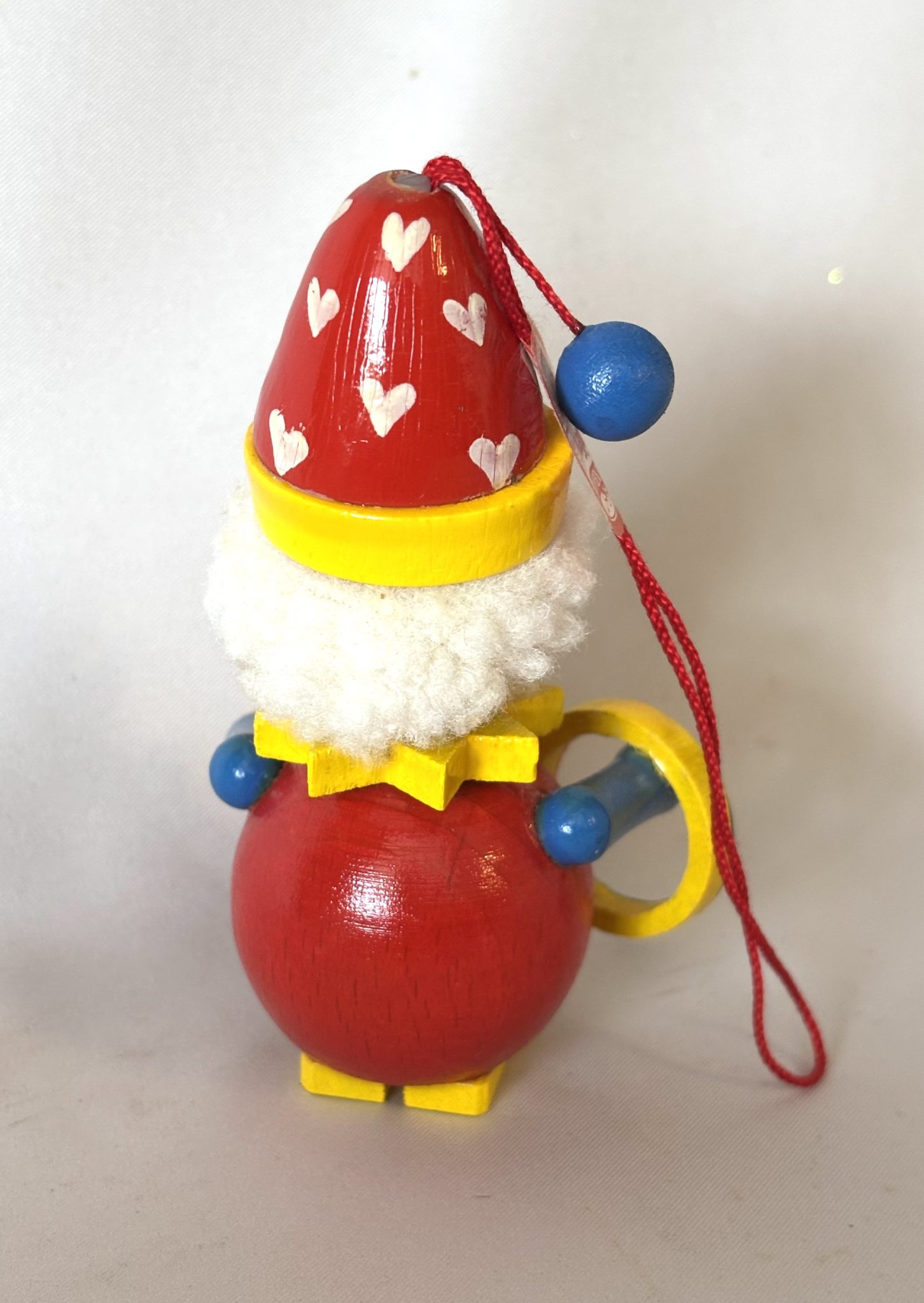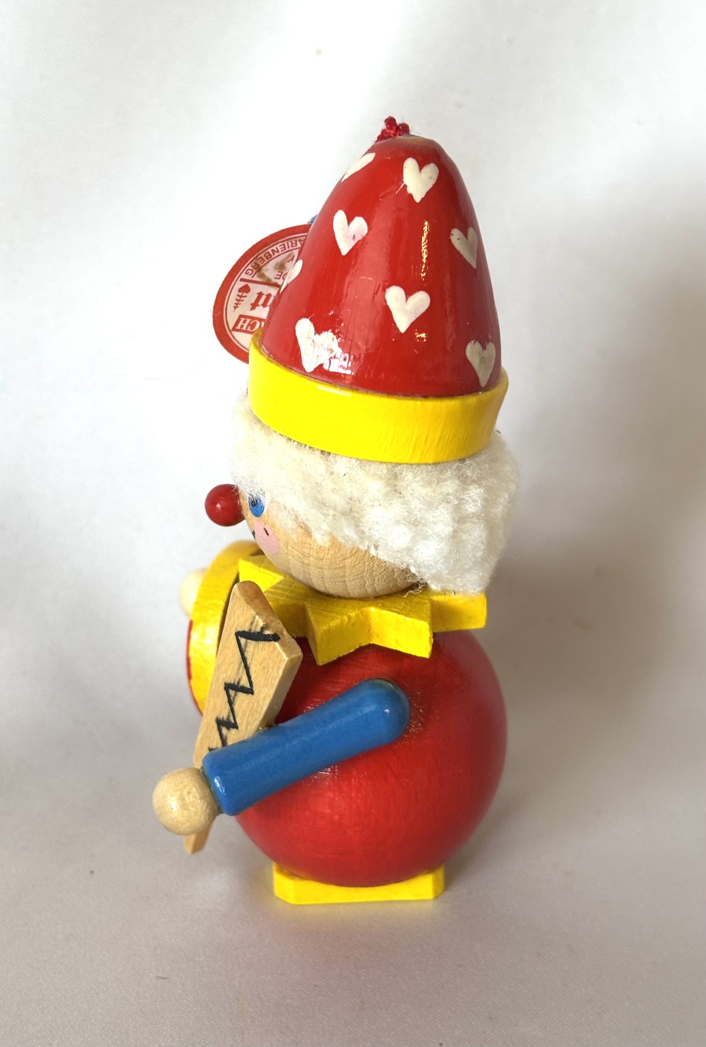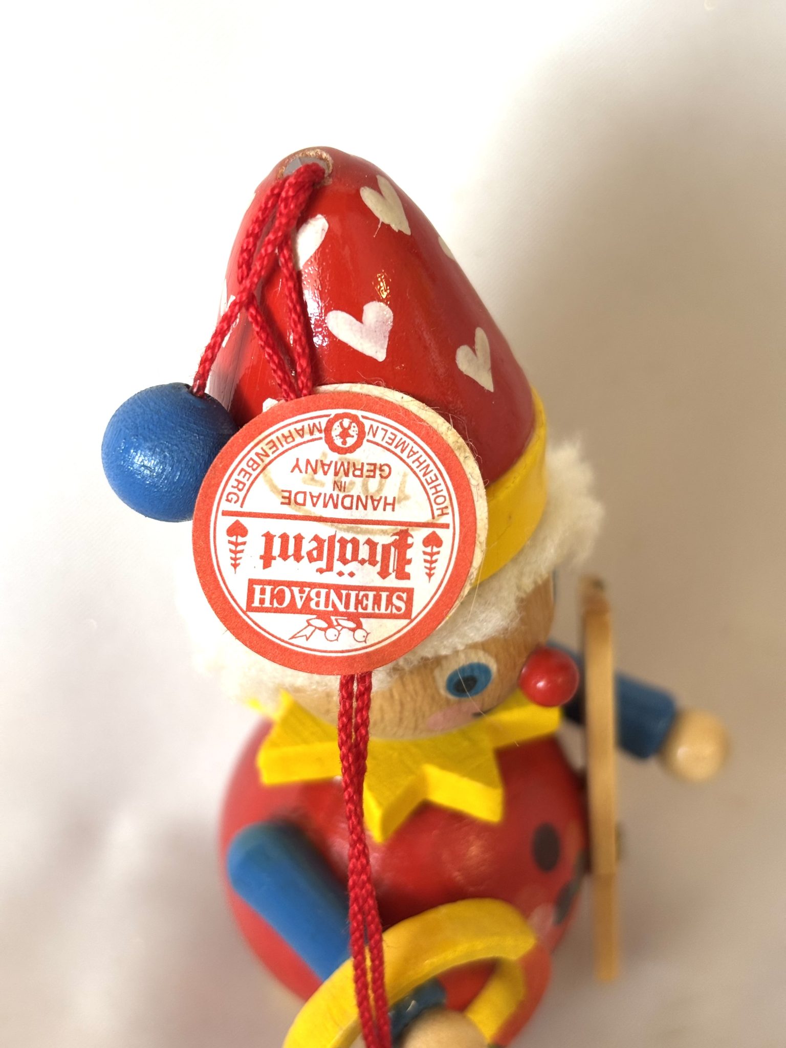 Steinbach is known for their quality craftsmanship and attention to detail. This little guy is adorable with his tall red cap, hand painted with white hearts. White fluffy hair peeks out from under the cap. He holds a juggling toy in each hand. (These often go missing over the years.) The long red cord hanging loop has a blue wood ball attached, as well as the original paper Steinbach tag which reads, “Steinbach Pralent Handmade in Germany, Hohenhameln, Marienberg”.