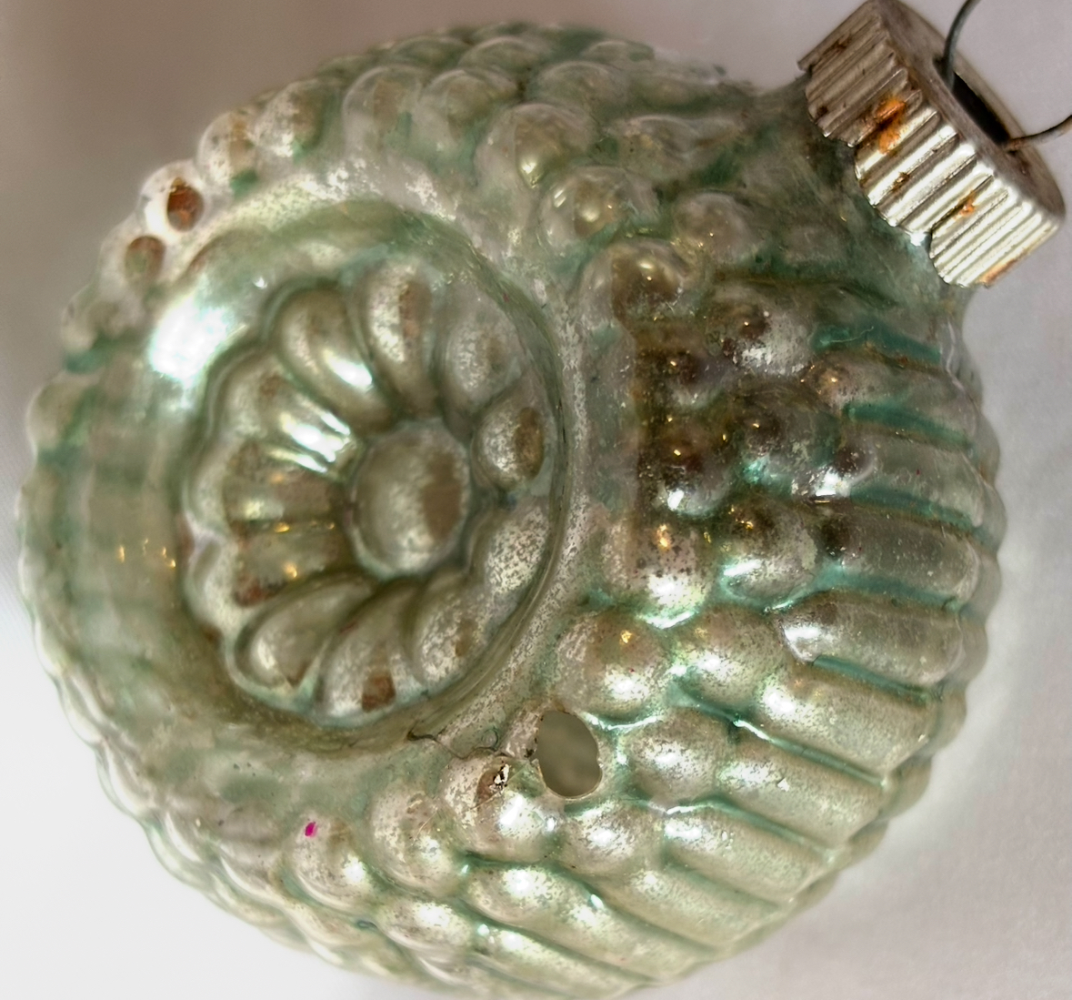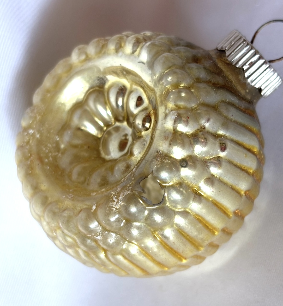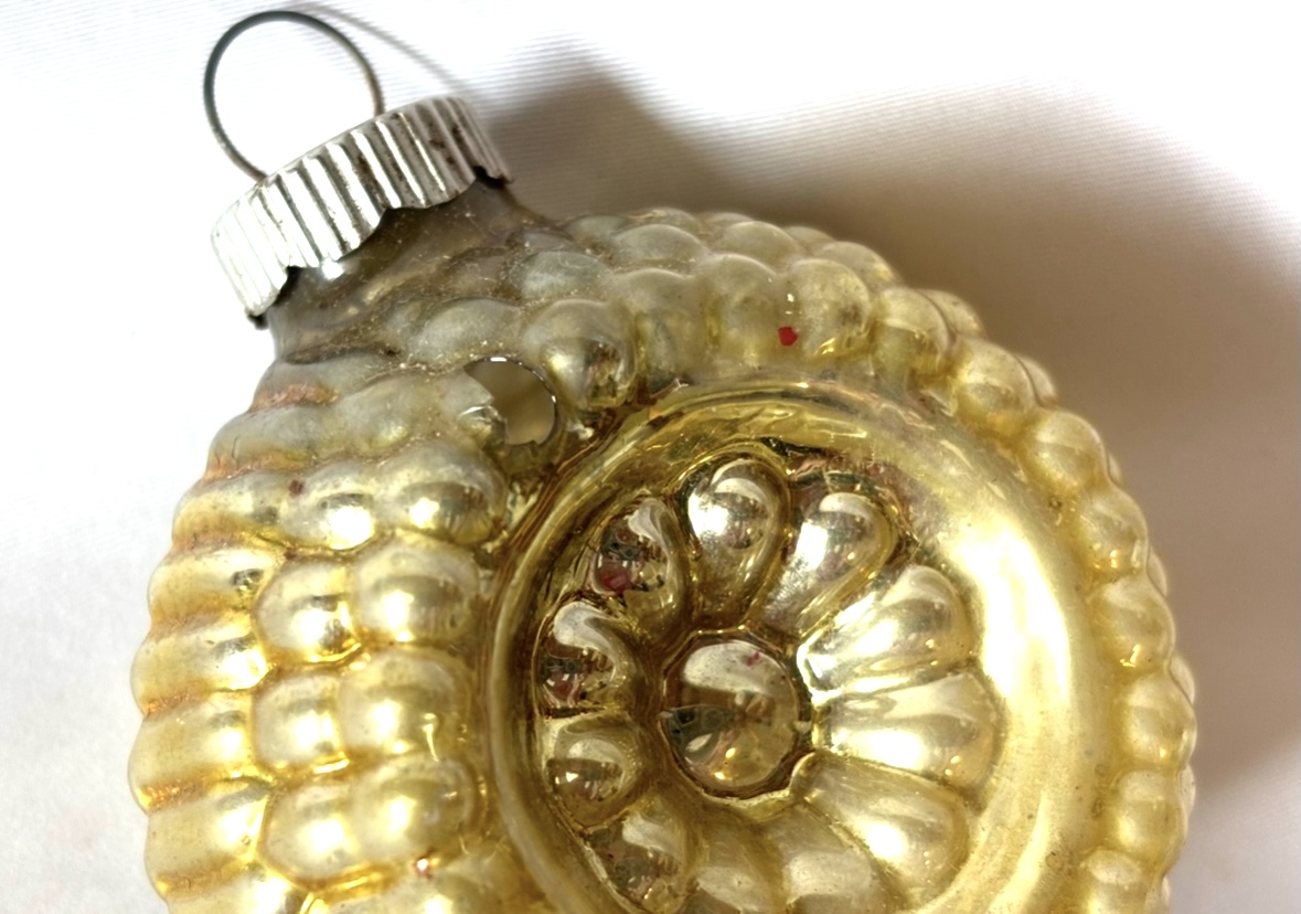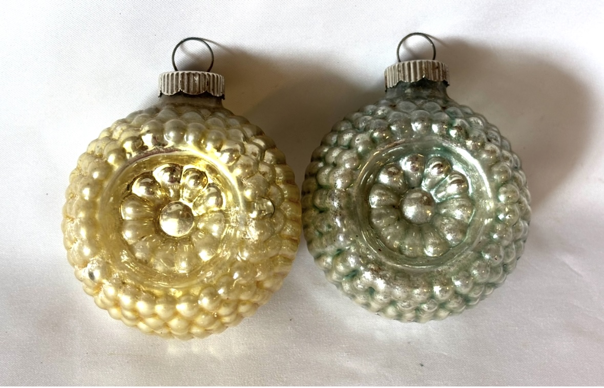 These are older Shiny Brite two sided ornaments featuring deeply molded radial floral-like indents and ribbed sides that create the bumpy look. One is gold and one light green, each measuring 2.25 inches wide and topped with the original classic metal ribbed cap which is marked, “Shiny Brite Made in U.S.A.”. The green ornament has one small hole on the bumpy edge, and the gold one has a small hole on each side. There is a bit of oxidation. Please view the photo details to see the size and location of the flaws which are small. They still display beautifully, a good addition to any Shiny Brite collection.