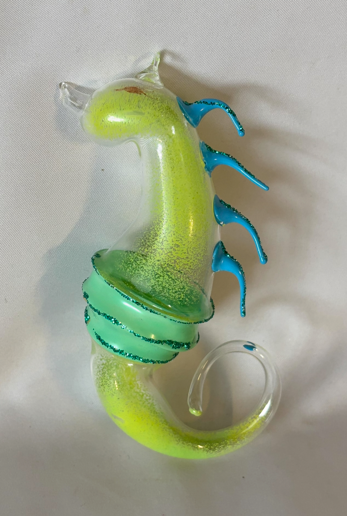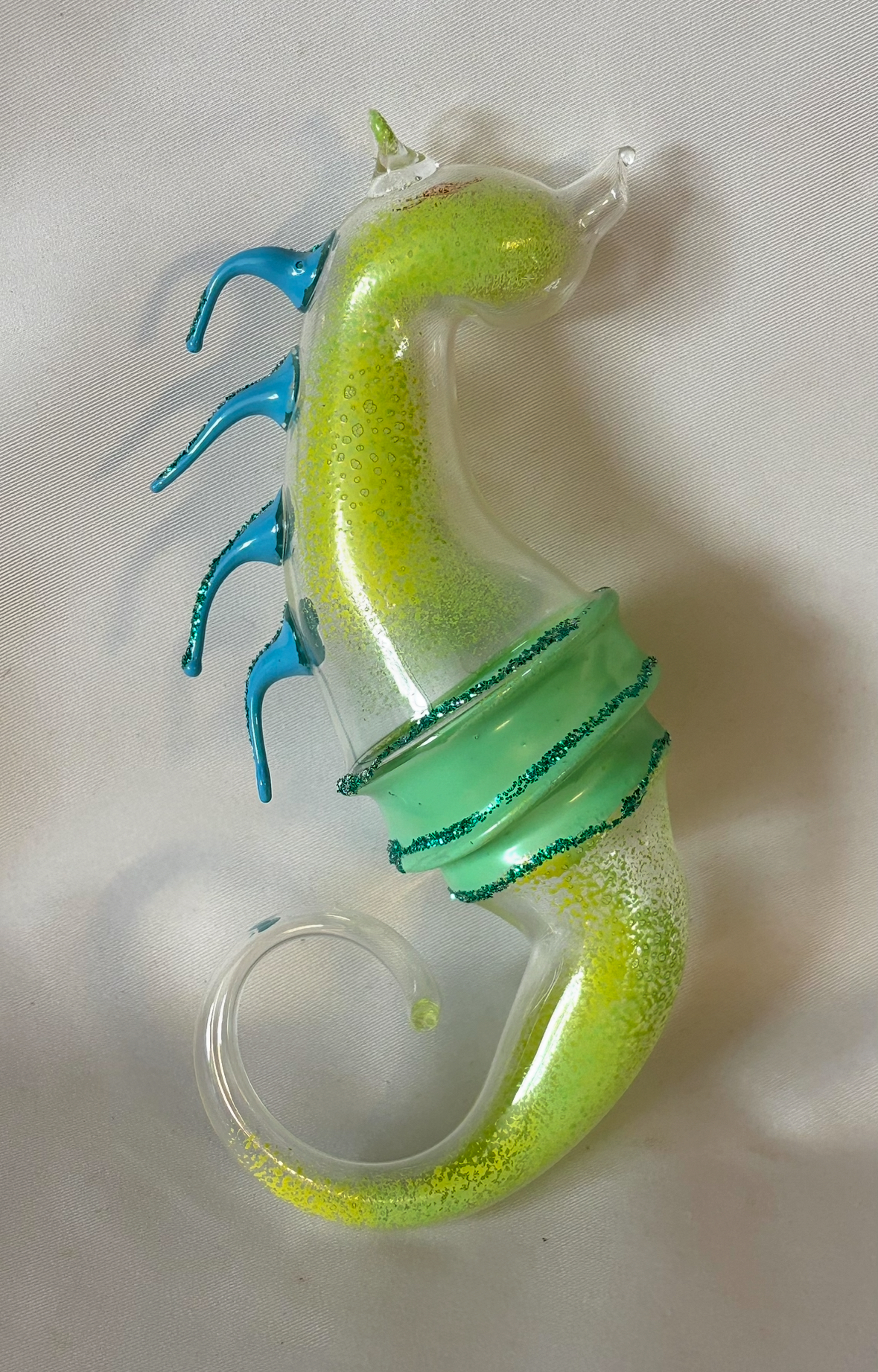 It is clear glass beautifully blown into the classic curved seahorse shape with a looped circle tail. The color is airbrushed with a bright green speckled pattern, and the center features a wide ribbed band with three glittered edges circling the form. Four bright blue annealed fins are attached on the back and it features hand painted eyes. It is finished with an annealed hanging loop at the top with the original thread hanging loop attached.