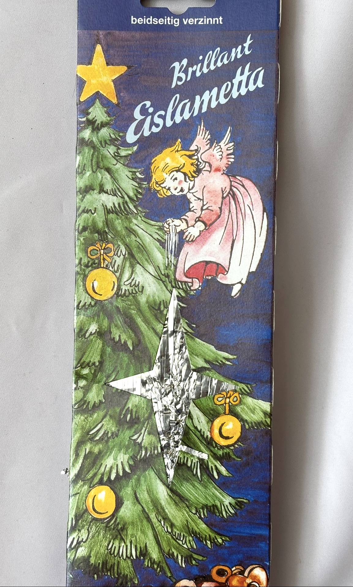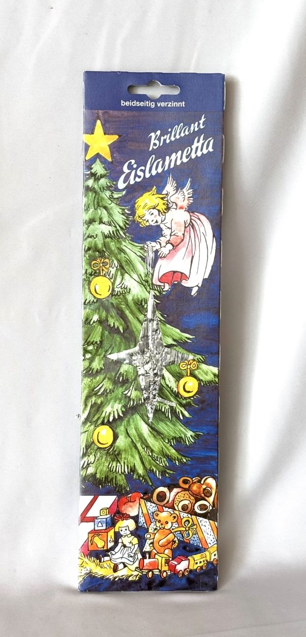 It is unused in its original packaging which is decoratively printed with classic colorful holiday imagery. There are oodles of toys and gifts arranged under the tall Christmas tree. A pretty blonde angel hovers above, decorating the tree branches with lametta. This is fine quality vintage German litho printing, showing lots of detail and bright colors with no fading. There is a die cut star window that shows the foil tinsel inside. The tinsel is bright silver and untarnished. It is flat and shows the usual crinkling which reflects the sparkling Christmas tree beautifully!