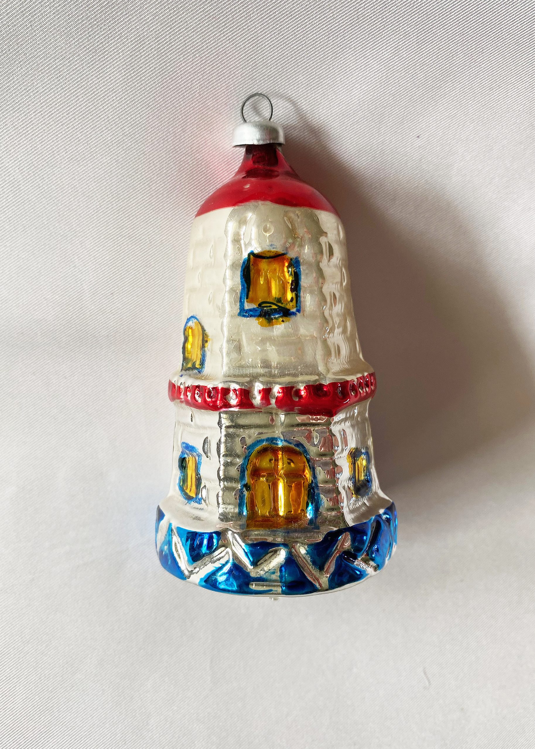 Wonderful vintage blown glass lighthouse tower ornament, circa 1950s.