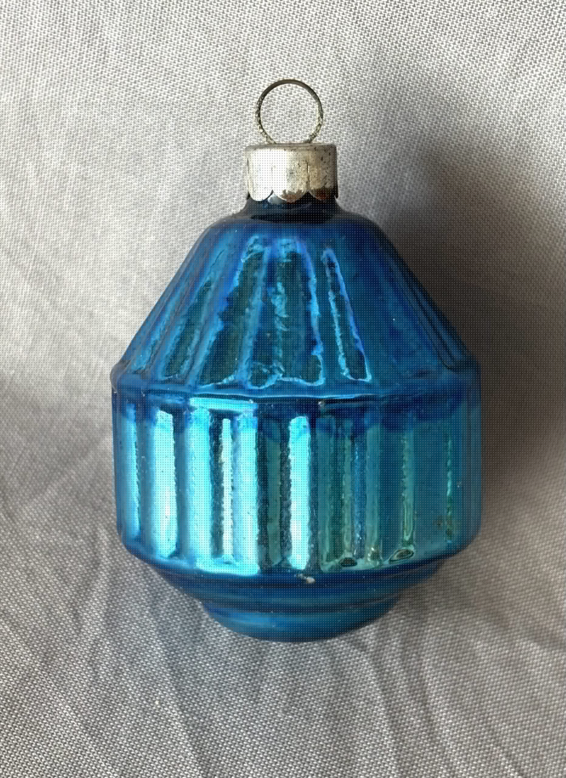 This is a wonderful and harder to find vintage American ornament that was first released in 1939 and discontinued after the war. It features multiple tapering panels which culminate in a rounded bottom. The color is so gorgeous with a turquoise quality.