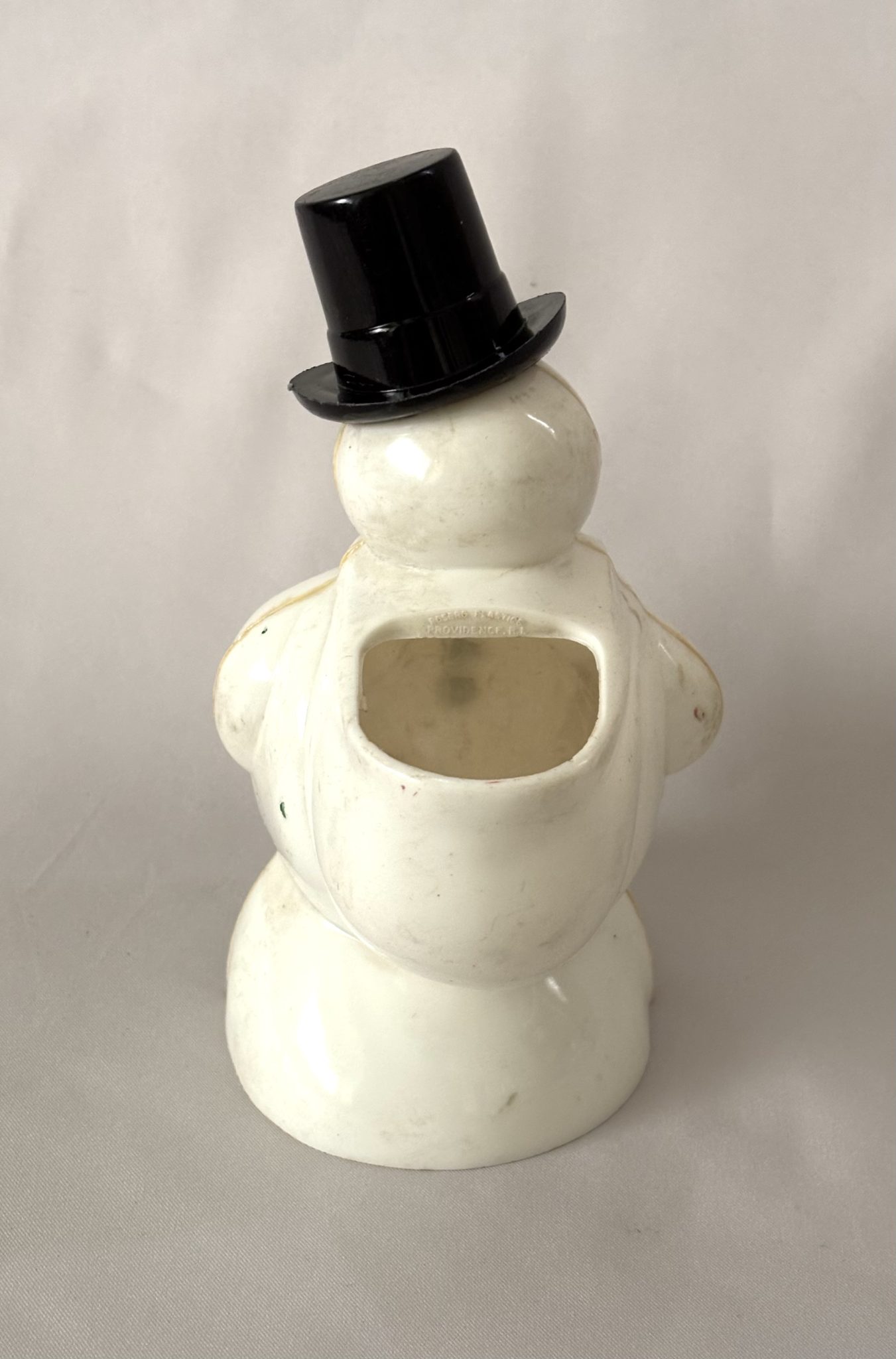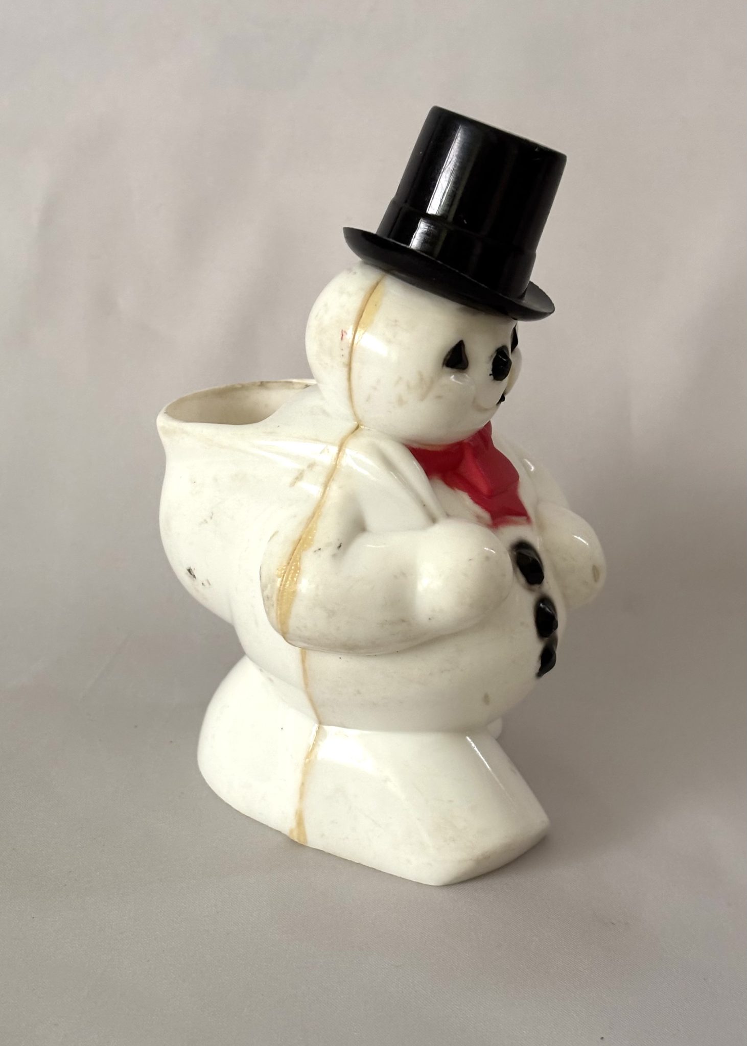 He is adorable and wonderfully molded, very similar to the well known Frosty the Snowman. He wears his black top hat and has triangle eyes and a button nose, with three black buttons on his chest. He wears a red scarf around his neck and holds a big sack over his shoulder which acts as the candy container.