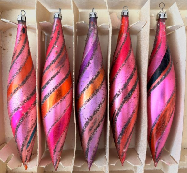 What a great set of sparkly 1950s Poland striped teardrop icicle Christmas ornaments. Fabulous and hard to find in such pristine condition!