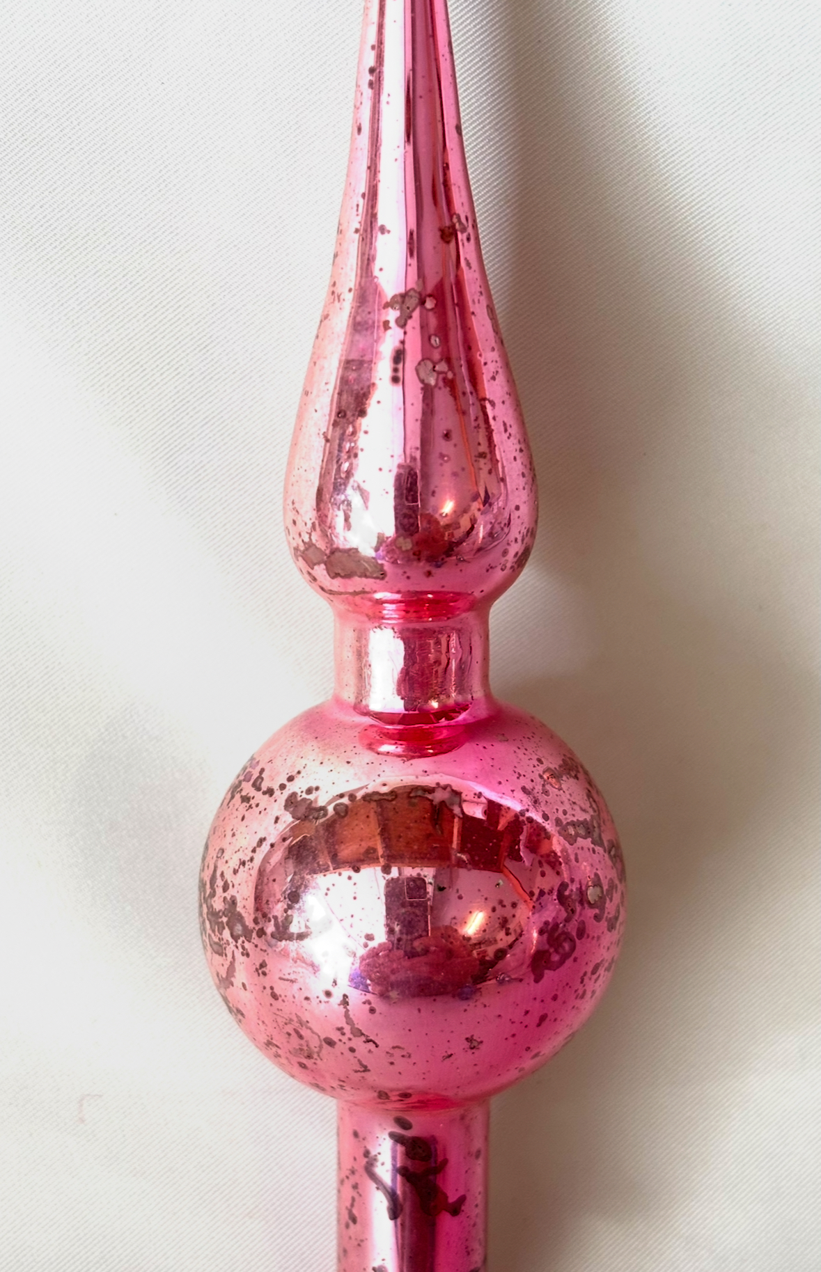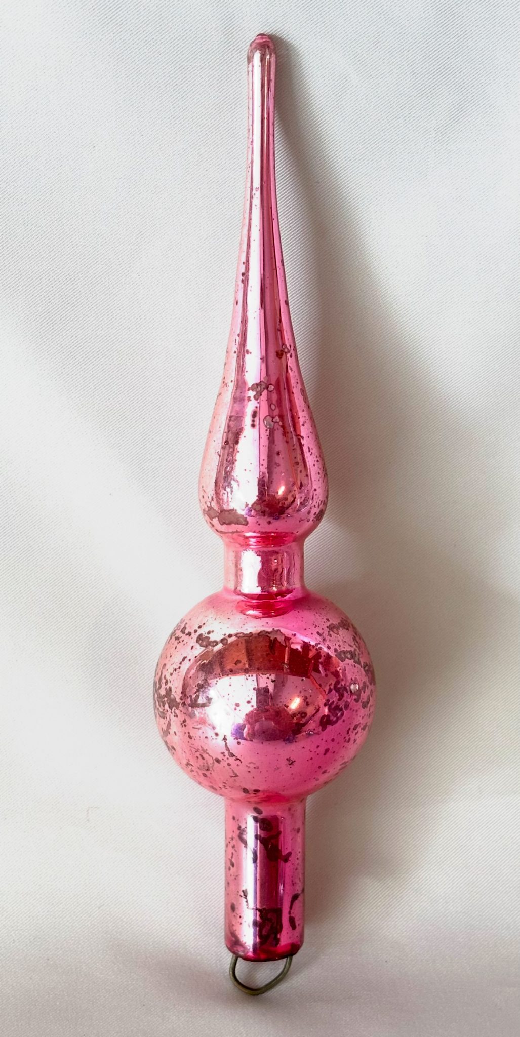 It’s a lovely bright pinnk color and stands 6 inches tall by 1.5 inches wide. It is in very good vintage condition free of chips or cracks. It shows the usual classic oxidation known to Paragon. It is a must-have tree topper for the Paragon or USA collector, great on a pink themed tree!