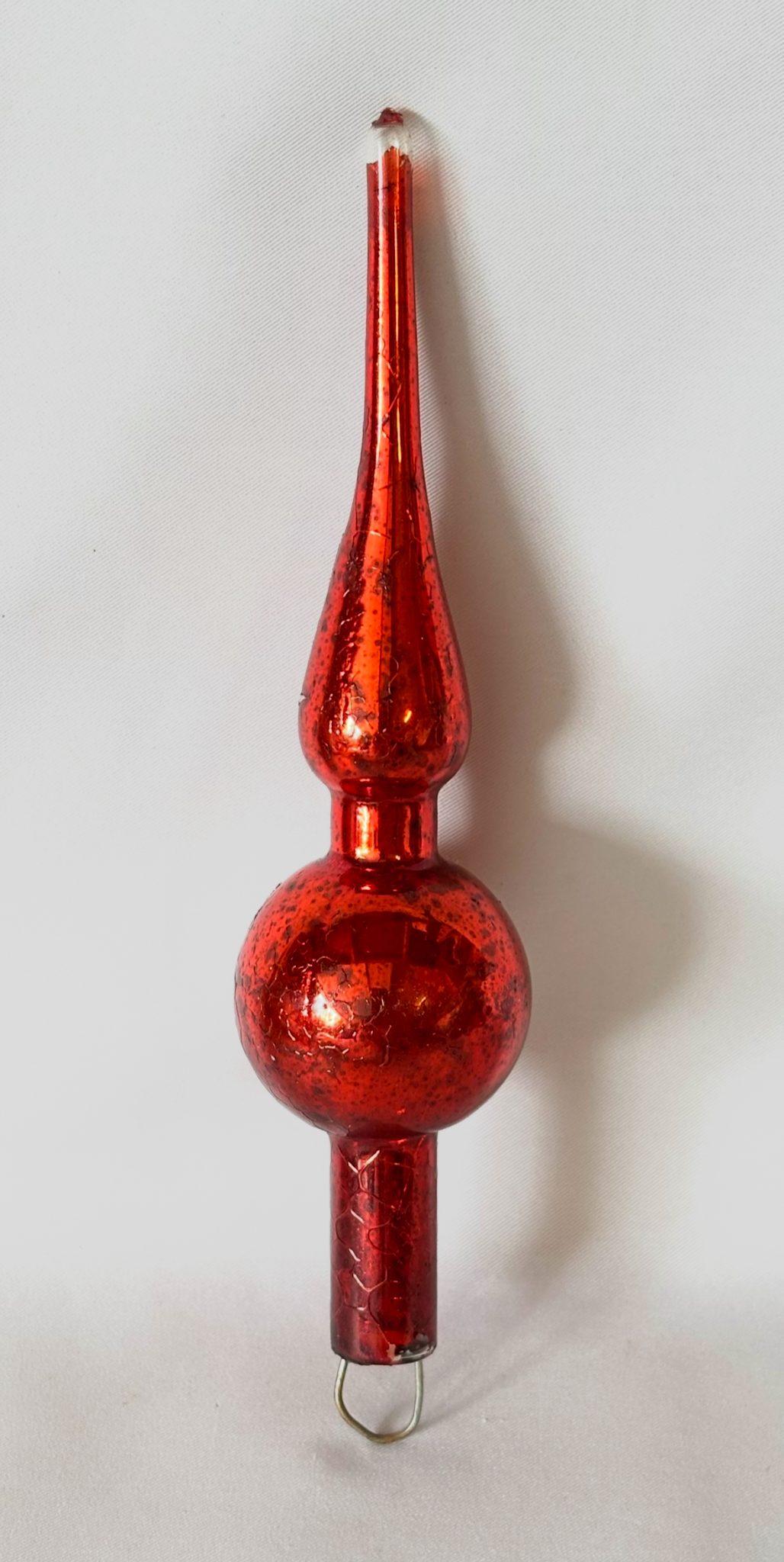 It’s a classic bright red color and stands 6 inches tall by 1.5 inches wide. It is in very good vintage condition free of chips or cracks, a bit of paint loss on the tip. It shows the usual classic oxidation known to Paragon. It is a must-have tree topper for the Paragon or USA collector, great on a Patriotic tree!