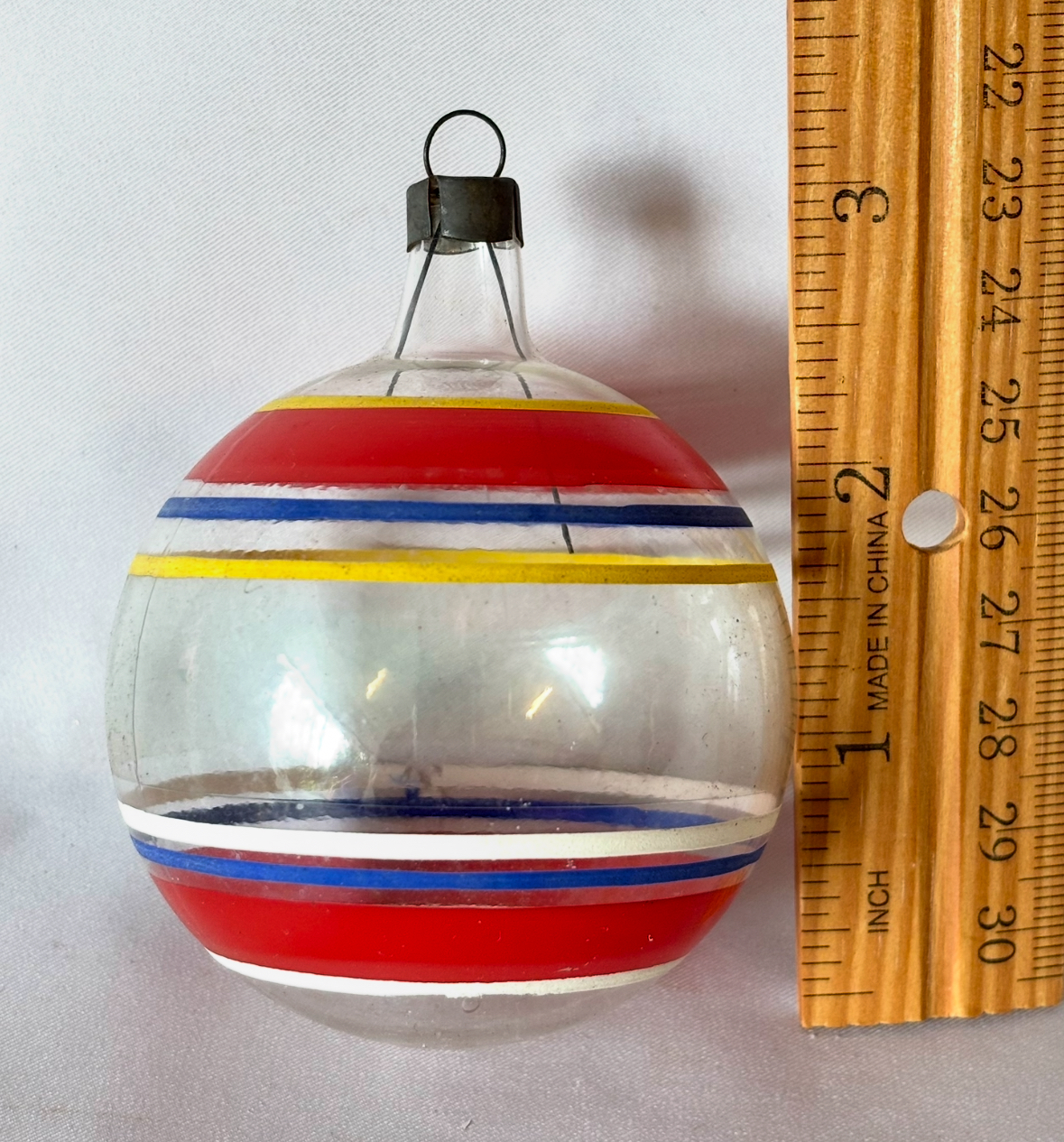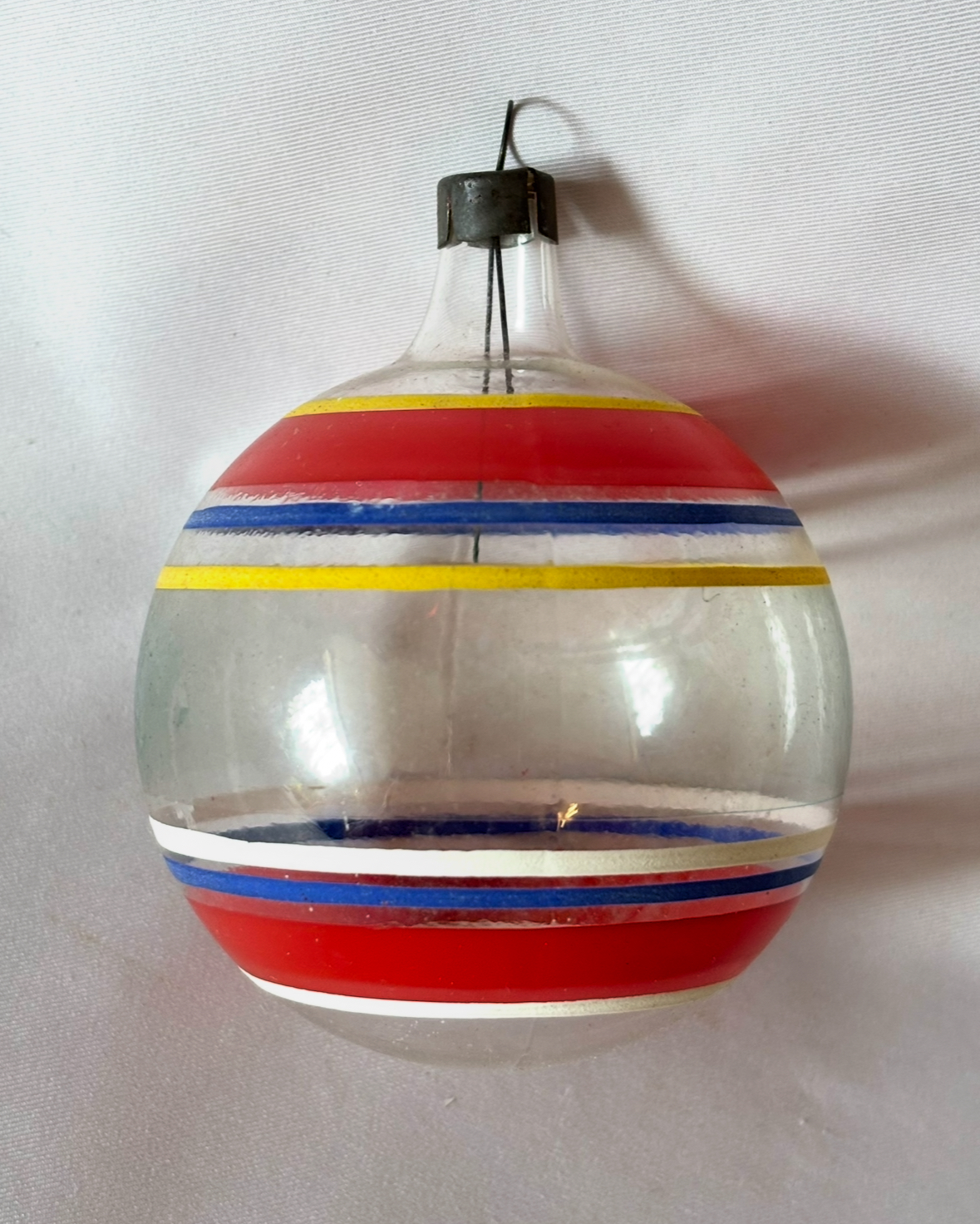 Classic war era unsilvered jumbo striped ornament American made by Premier, early 1940s.